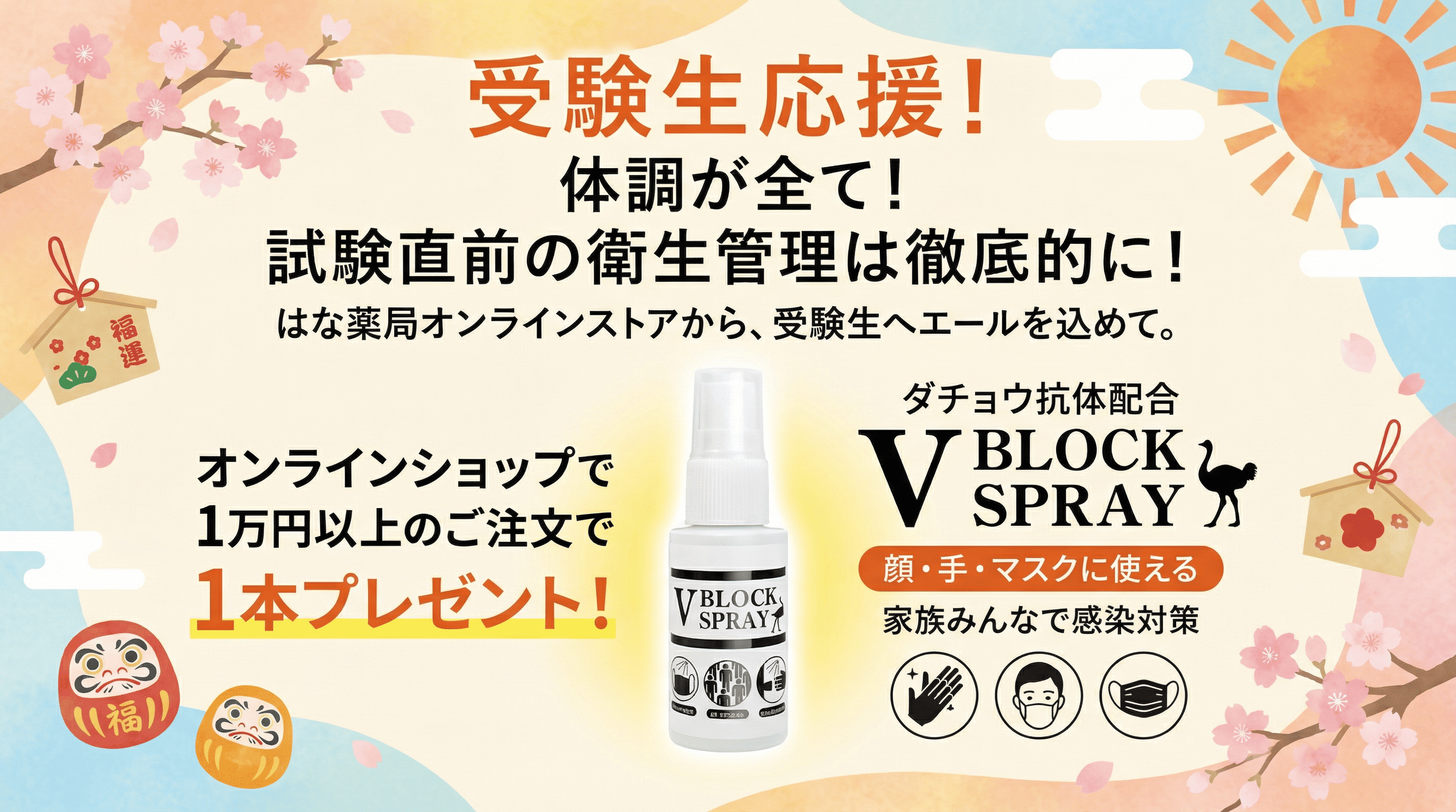 🌸受験生応援📣受験生は体調管理が超大事!はな薬局オンラインストアにて1万円以上のご注文で、ダチョウスプレー1本プレゼント!コロナ時に大活躍したウイルス抗体効果抜群のダチョウ抗体配合 V Block Sprayです。家族全員でしっかり感染対策!